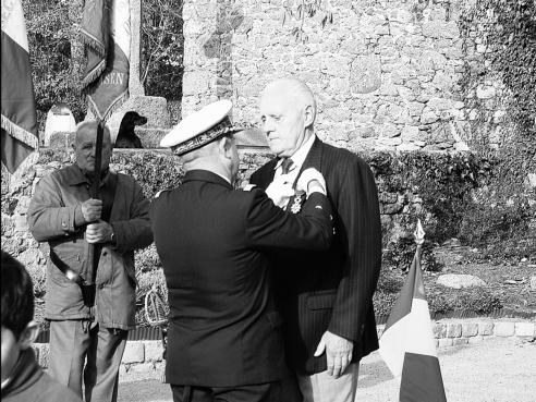 A cette occasion, Louis Moal a été fait chevalier de la Légion d'honneur. Cette médaille vient récompser les faits de guerre de Louis Moal. L'amiral Nerzic les a rappelés. Louis Moal a rallié Ouessant par l'Enez-Eussa, le 18 juin 1940, afin de traverser la Manche au sein d'un groupe de jeunes Bretons, sur le Mousse-Le Moyec, à destination de Plymouth. Le 4 juillet, Louis Moal signe un engagement dans les FNFL (Forces navales françaises libres). Le 20 août, il embarque sur le vieux cuirassé Courbet. Le 17 janvier 1941, Louis Moal embarque sur le Reine-des-Flots, ancien chalutier terre-neuvier de Fécamp, armé en patrouilleur. Après un an de patrouilles entre la Grande-Bretagne et l'Irlande, le Reine-des-Flots est transféré en Méditerranée pour arriver à Beyrouth fin février, avec pour mission l'escorte de pétroliers. En octobre, un brillant engagement contre les Stukas vaut une citation au Reine-des-flots. Loulou Moal vient d'avoir 20 ans. Le patrouilleur participera aux opérations de libération de la Grèce. Le 17 avril 1945, le Reine-des-flots arrivera à Toulon, après 4 ans et 10 mois d'absence, dont 47 mois à la mer.