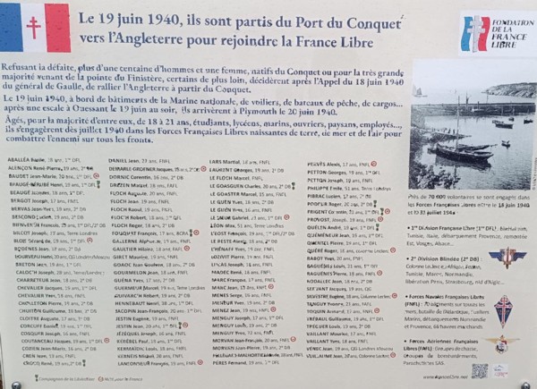 - Le 19 juin 1940, 107 volontaires conquétois ou du Finistère quittent le port pour l'Angleterre. 85 ans après l’Appel du 18 juin 1940, la mairie et la fondation de la France Libre font œuvre de mémoire et de recherches historiques.