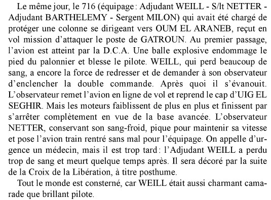Au cours d’une mission en Lybie, blessé, il a ramené l’appareil à Zohar et à la fin de l’atterrissage impeccable est mort d’épuisement . N’est ce pas là une belle mort ? Pauvre Weil , il a fait son devoir , plus que son devoir et j’espère que plus tard nous saurons faire respecter sa mémoire.