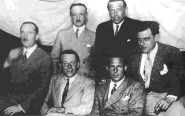 " Montevideo, 25 janvier 1933. Assis, de gauche à droite : Louis Mailloux, René Couzinet, Jean Mermoz, Jean Manuel; debout : Angel S. Adami et Pierre Carretier (archives du Musée aéronautique)."