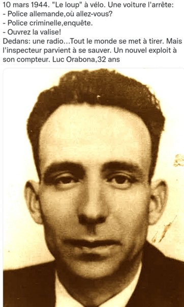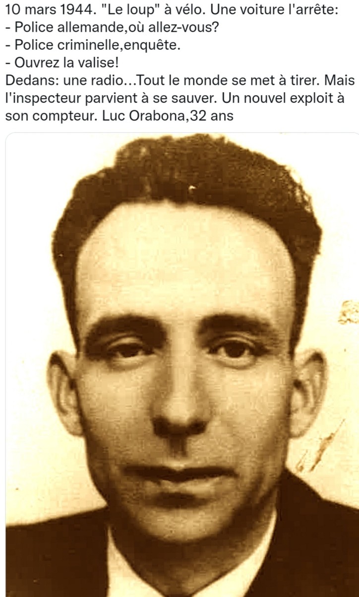 (15) Né en 1912 à Ajaccio (Corse). Le 10 mars 1944, avec un agent de protection, l’inspecteur parvient à échapper à quatre Feldgendarmes qui tentaient de fouiller ses bagages, alors qu’il circulait à vélo, avec son poste, vers Orgelet (Jura)… Après un échange de coups de feu entre les Allemands et les deux Français, ces derniers peuvent fuir à travers bois après avoir tué un de leurs adversaires. Le poste reste entre les mains des Occupants, sans les quartz. Orabona émettait normalement depuis Pannessières où résidait son beau-frère, Louis Azario. Après la confrontation avec les gendarmes allemands, Orabona doit se réfugier à Toulouse. Quand les Allemands opèreront un grand coup de filet sur les radios en région lyonnaise, le policier revient sur place, réorganise son dispositif radio et recrute à cette fin une trentaine d’agents...."