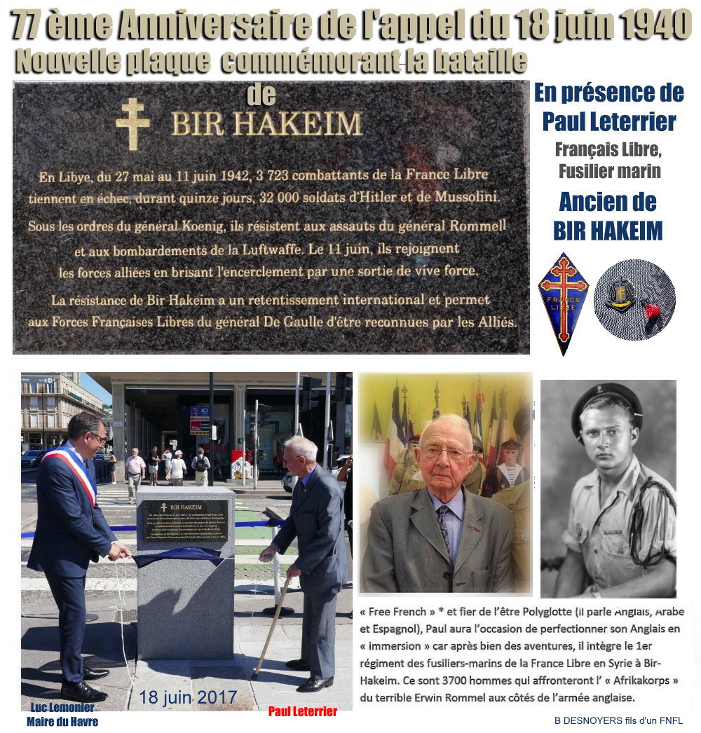 Je me présente : je m'appelle Jocelyne MAS fille d'André FOUGERE né à Donville les Bains le 13-1-1913. Mon père a combattu aux côtes de Paul Leterrier pendant les campagnes de Bir-Hakeim, El-Alamein, la Lybie ... au bataillon des Fusiliers-Marins de la 1° division française libre. Ils ne sont jamais quittés. Les Leterrier étaient nos voisins à Bains-Romains près d'Alger. Il est le seul survivant. J'ai lu le livre de Monsieur Bertrand Chatel où on retrouve Constant Colmay, Rabion, Pierre Iéhlé, Savary etc..Les Colmay habitaient la Madrague près de chez nous en Algérie. Je suis écrivain et dans mon livre " Chez nous en Algérie la méditerranée était au nord" il y a un grand paragraphe en hommage à tous ces hommes fiers et courageux qui se sont battus pour que vive une civilisation d'hommes libres, comme le disait le Révérend Père Savey.