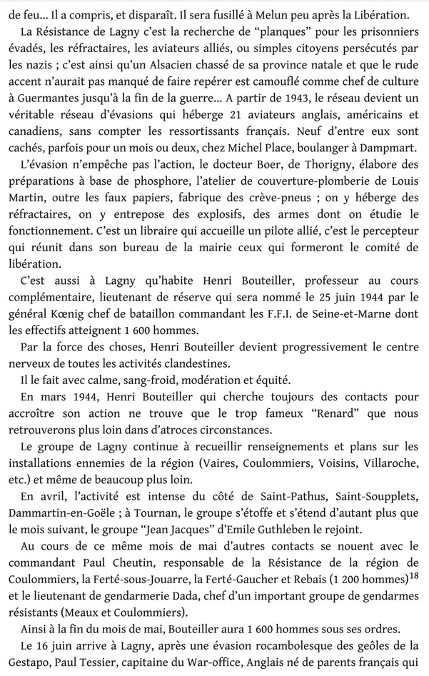.....Médéric, inquiété et recherché par la Gestapo est caché par nous à Paris et envoyé sur la Grande Bretagne. Nous apprenons par un message personnel qu’il est bien arrivé : « Médéric dit bonjour à Crischna ». Nous sommes passés en compte à M. de Pillot de Coligny, dit Charles Emmanuel. Celui-ci demande à M. Bouteiller, dit Octave, de constituer une compagnie de Corps Francs dans la région de Lagny.