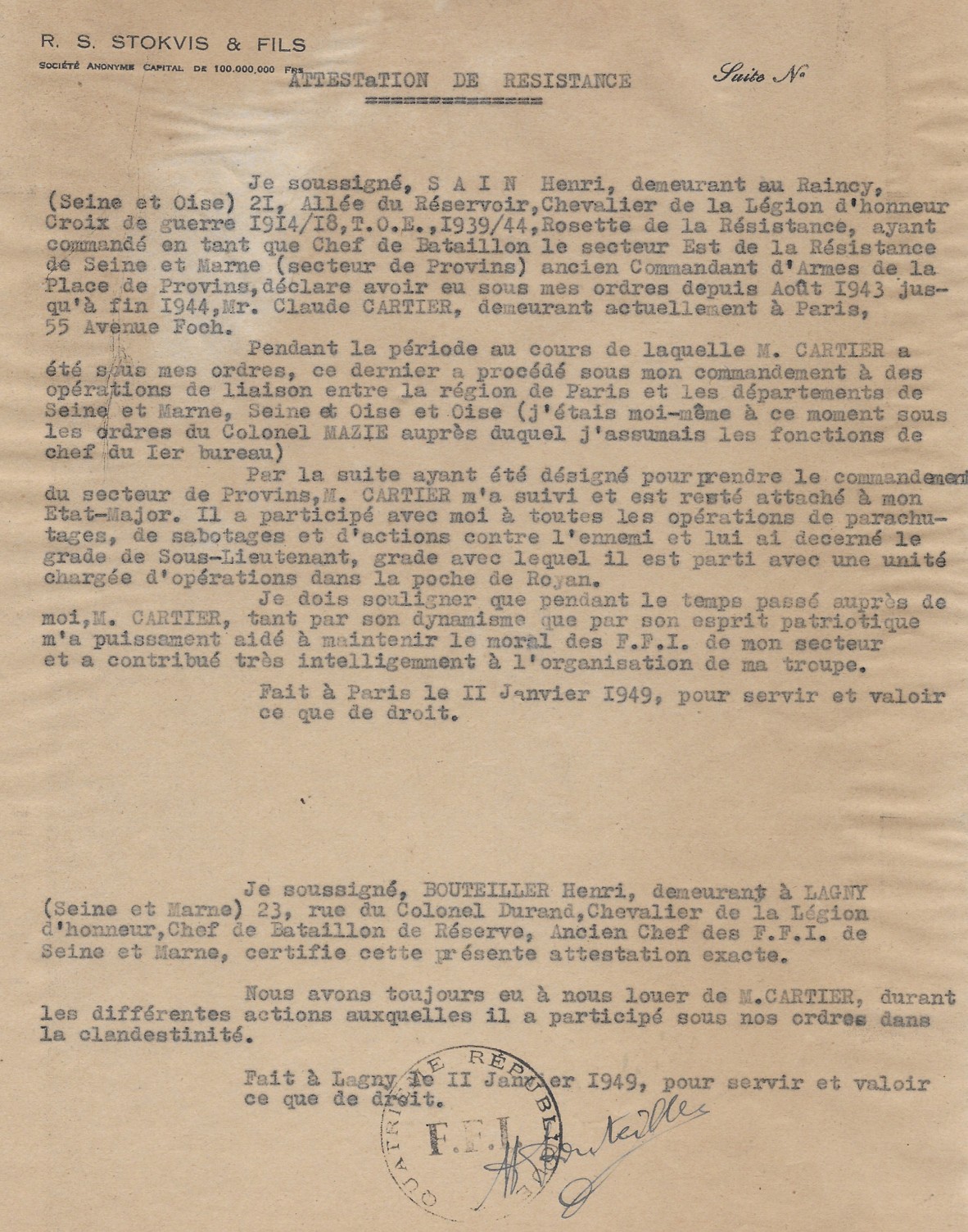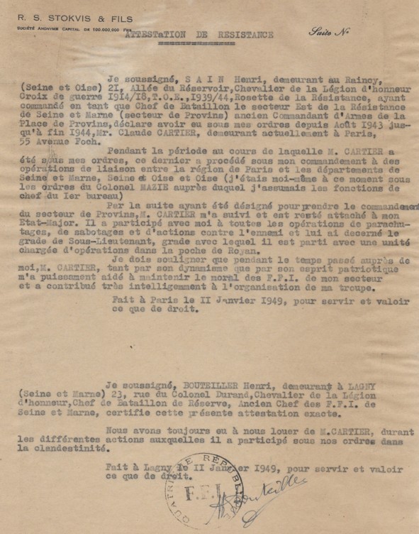 Henri Armand Bouteiller - son Livre ouvert ! Certification attestation résistance délivrée à Mr CARTIER Claude (S/Lt FFI) par Cdt SAIN Henri Certification de l'attestation de résistance délivrée à Monsieur CARTIER Claude (S/Lt FFI) par le Cdt SAIN Henri, secteur est résistance Seine et Marne, ancien cdt de la Place de Provins.