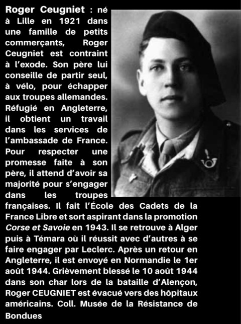 Les Mémoires de Roger Ceugniet, retracent le parcours de ce lillois né en 1921, son arrivée en Angleterre en mai 1940, son engagement dans les Forces Françaises Libres, sa formation en Afrique du Nord et la bataille de Normandie.