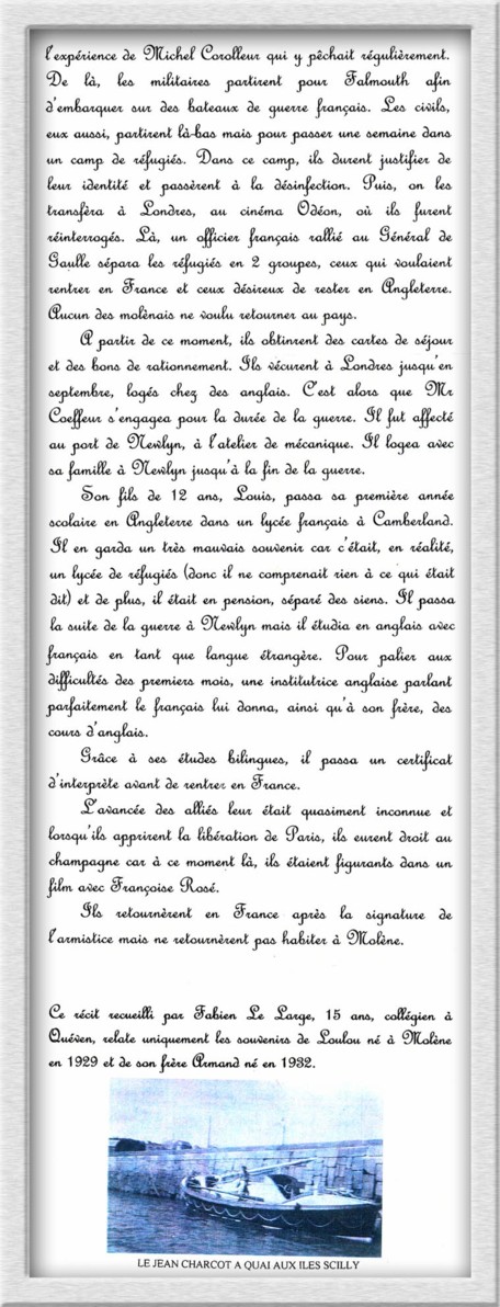 At the fall of France he brought his lifeboat and its crew to Newlyn, near to Penzance, leaving his wife and nine of his ten children on Molene. He never returned home alive.