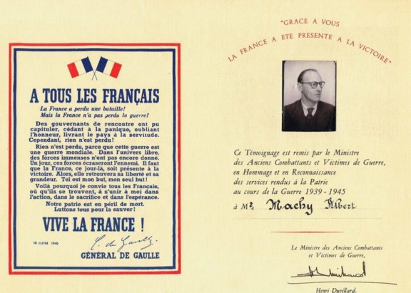 « CE CERTIFICAT DE SERVICE DONNE MON APPRECIATION SUR L’AIDE RENDUE PAR ALBERT MACHY, COMME VOLONTAIRE AU SERVICE DES NATIONS ALLIEES POUR LA GRANDE CAUSE DE LA LIBERTE ».