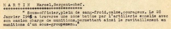 Inhumation du sergent-chef Martin Marcel Mon père, le sergent-chef Marcel MARTIN, est décédé le 17 janvier dans sa 98eme année. Ancien du 4eme dragons, de la 1ere CACC du général de gaulle, du 501eme RCC et de la 2eme DB, il a passé toute la seconde guerre mondiale loin des siens pour aider la patrie en danger. Titulaire de la Légion d’honneur pour faits de guerre et de la Médaille Militaire, entre autres, il a été inhumé le 18 janvier au Liban, près de son épouse également décédée, en présence de Son excellence l’ambassadeur de France á Beyrouth monsieur Emmanuel Bonne, de la Consule générale de France Madame Cécile Longé, du colonel attaché de défense auprès de l’ambassade de France á Beyrouth, des colonels Ch-L. Mallez, G. Figuié, J-P. Marmouget, E. Croisille, de l’ambassadeur Marcel Laugel et de ses anciens camarades de l’amicale des anciens combattants de l’armée française résidant au Liban, de son fils, de sa famille et de tous ses amis. L’ambassadeur de France et le colonel Mallez lui ont rendu un vibrant hommage pour sa vaillance dans la guerre comme dans la vie civile. Retiré au Liban près de son fils il a terminé sa vie là où tout avait commencé avec son épouse.
