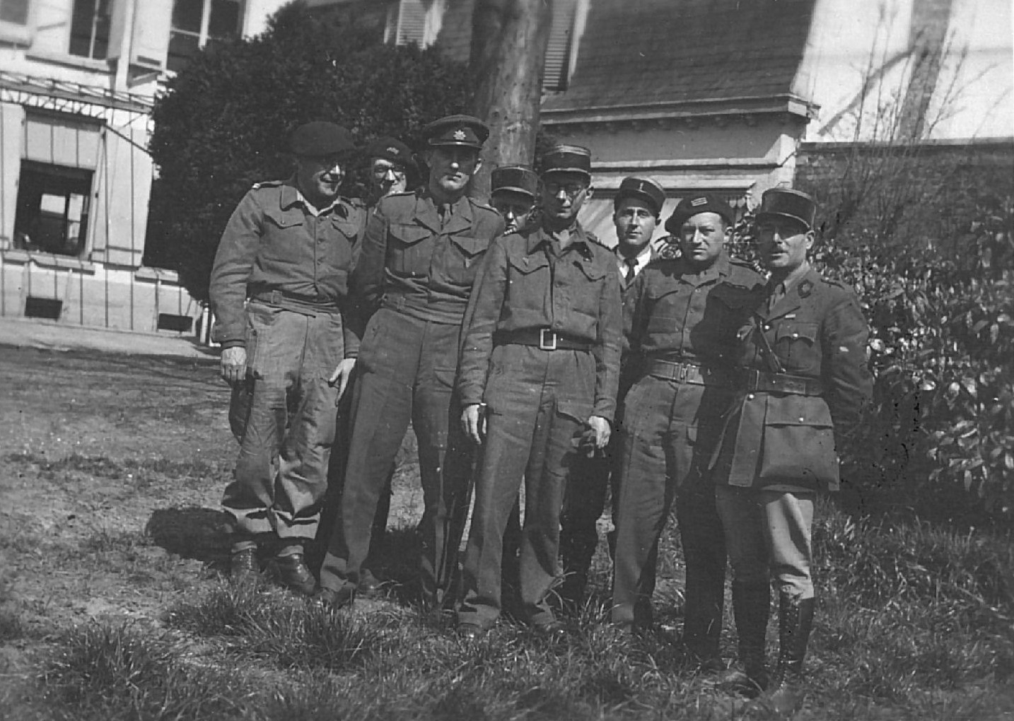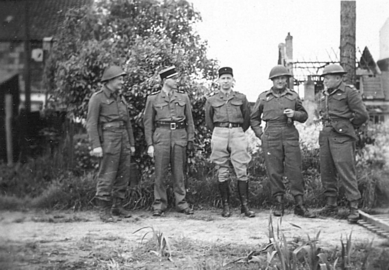 En 1945 à la libération de Bergues (Nord) Un groupe d'officiers Anglais et Français, le deuxième en partant de la gauche est Maurice SCHUMANN