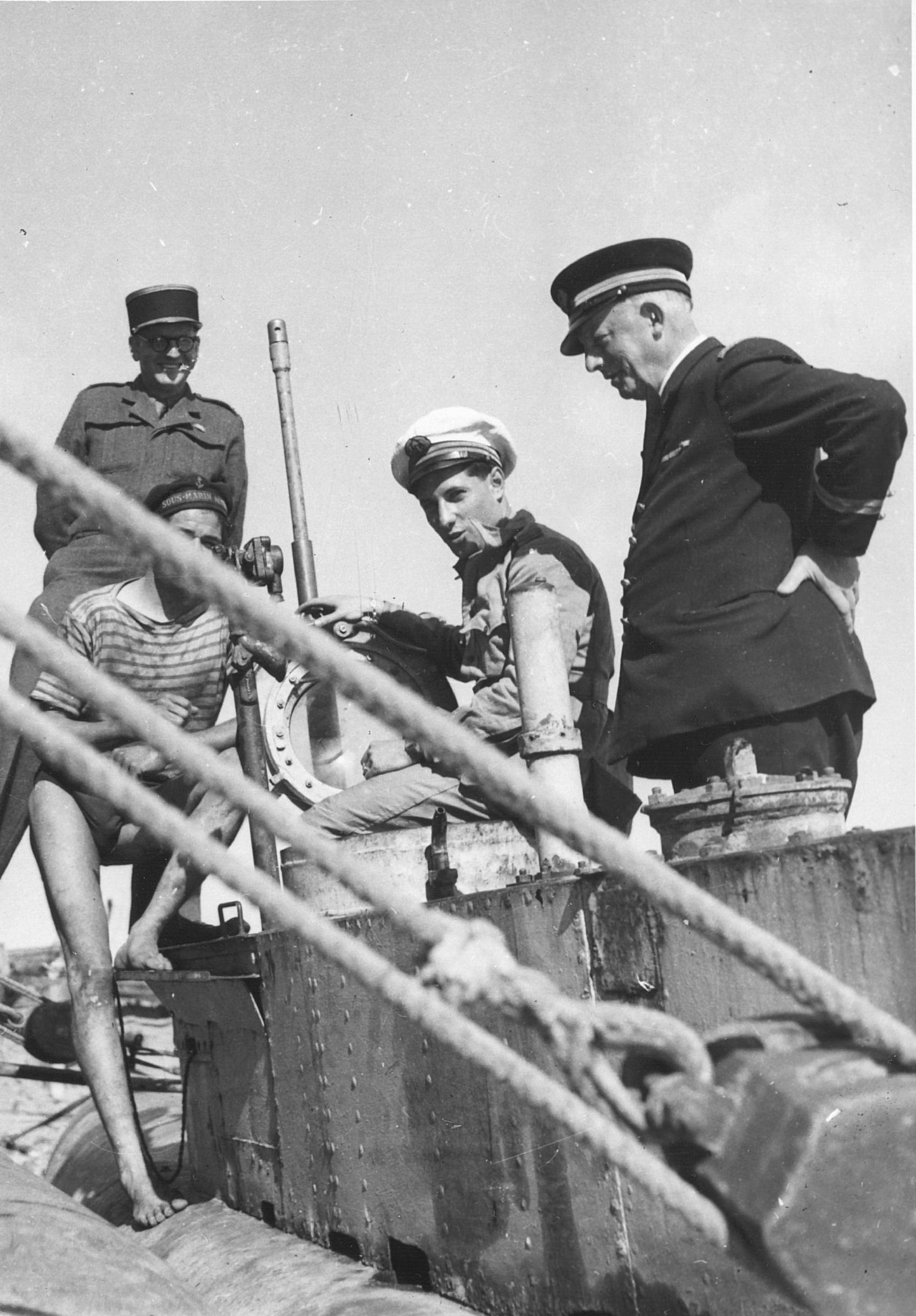 A Dunkerque en 1945, sur l'un des quatre sous-marins de poche pris à l'ennemi Allemand de gauche à droite sur la photo : Maurice SCHUMANN, un marin, l'Enseigne de vaisseau François A'WENG et l'Enseigne de vaisseau Albert CHATELLE
