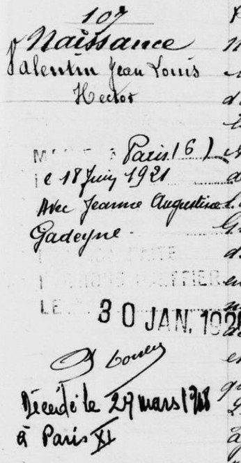 Jean Louis Hector Valentin alias Louva - son Livre ouvert ! Acte de naissance GADEYNE Jeanne Augustine - Paris 19e 28/07/1901 - Toulon 13/06/1983