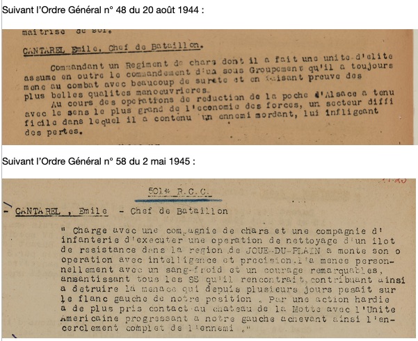 " Le 1er juillet 1943 à Sabratha en Libye, Émile Cantarel, reçoit du général Leclerc le commandement du 501e Régiment de chars de combats. En mai 1944, il se distingue avec son régiment dans des combats en Normandie. Il participe ensuite à des combats en Alsace et à la prise de Bertchesgaden. Il participa aussi aux guerres d'Indochine et d'Algérie
