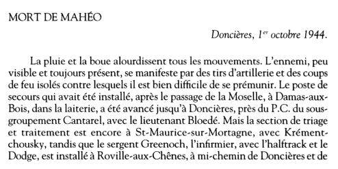 CARNET DE RETOUR AVEC LA DIVISION LECLERC une oeuvre de BOURDAN PIERRE " Sur le flanc est, c'était la même chose. Les chars étaient immobilisés, en position d'attente ; ils étaient plus un problème qu'une aide : problème d'entretien constant et de camouflage. Au village de Doncière, au début d'octobre, le commandant Cantarel, un tankiste né, qui, à trente-deux ans, avait reçu le commandement du 501e de Chars, était arrosé dans son creux de vallée par les pièces allemandes montées sur la colline, aux bords du chateau de Doncières, ripostait au canon, planquait ses chars et, comme tout le monde, attendait." laurent le samedi 18 juillet 2009 - Demander un contact Recherche sur cette contribution | |
