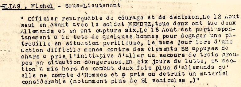 Carnets de route d'un croisé de la France Libre,de Raymond Dronne " La 2e section était commandée par le sous-lieutenant Elias, avec comme adjoint le sergent-chef Garces. Tous deux formaient une excellente équipe.