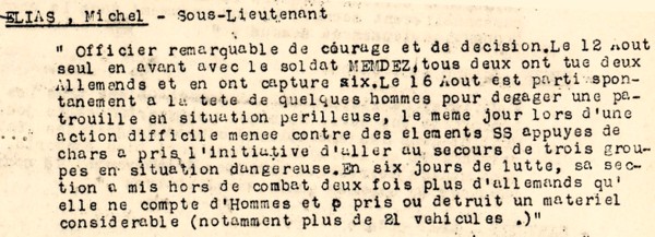 Michel Elias n'est pas Espagnol, comme son nom pourrait le laisser supposer. Il est né natif français. Il était parmi les plus jeunes ; élève à l'Ecole nationale de la France d'Outre-Mer à Paris, il se destinait à ce qu'on appelait alors une carrière coloniale. Entré dans la résistance, il avait abandonné ses études, traversé l'Espagne — où il connut les joies du camp de Miranda — rejoint l'Afrique du Nord. Il avait été affecté à la compagnie dès sa constitution, parce qu'il parlait espagnol. Alors que la plupart des half-tracks portaient des noms de villes ou de batailles d'Espagne, il avait baptisé sa voiture de chef de section : Résistance." Laurent Laloup le samedi 20 septembre 2008 - Demander un contact Recherche sur cette contribution | |